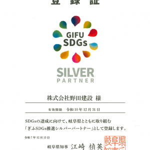 ぎふSDGs推進パートナー(シルバー会員)に登録されました|株式会社野田建設