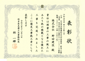 【お知らせ】岐阜県 県土整備部・都市建築部 優良工事施工者表彰を受賞しました